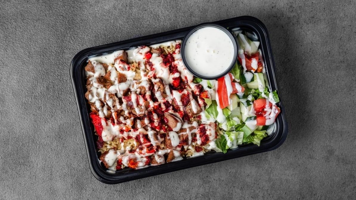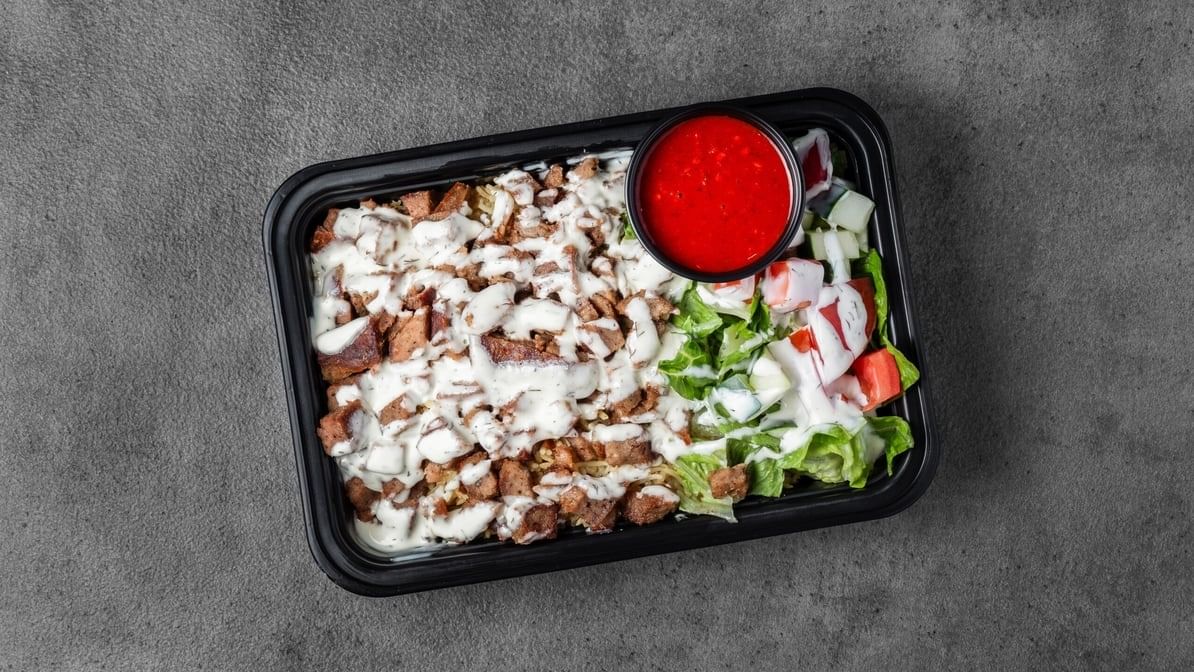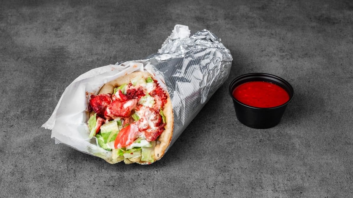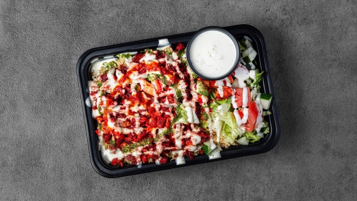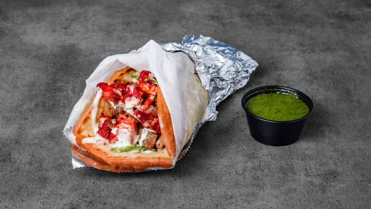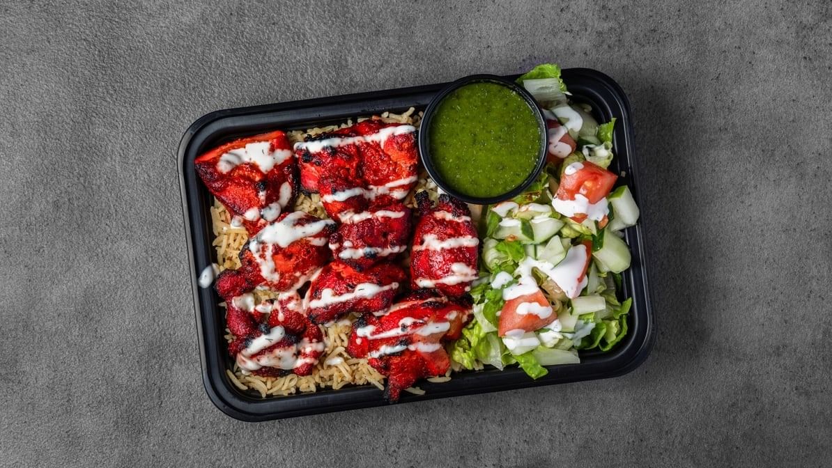 Marinated chicken slowly cooked in a tandoor oven with salad, rice, & sauce. Choice of toppings: Tomato, lettuce, jalapeño.