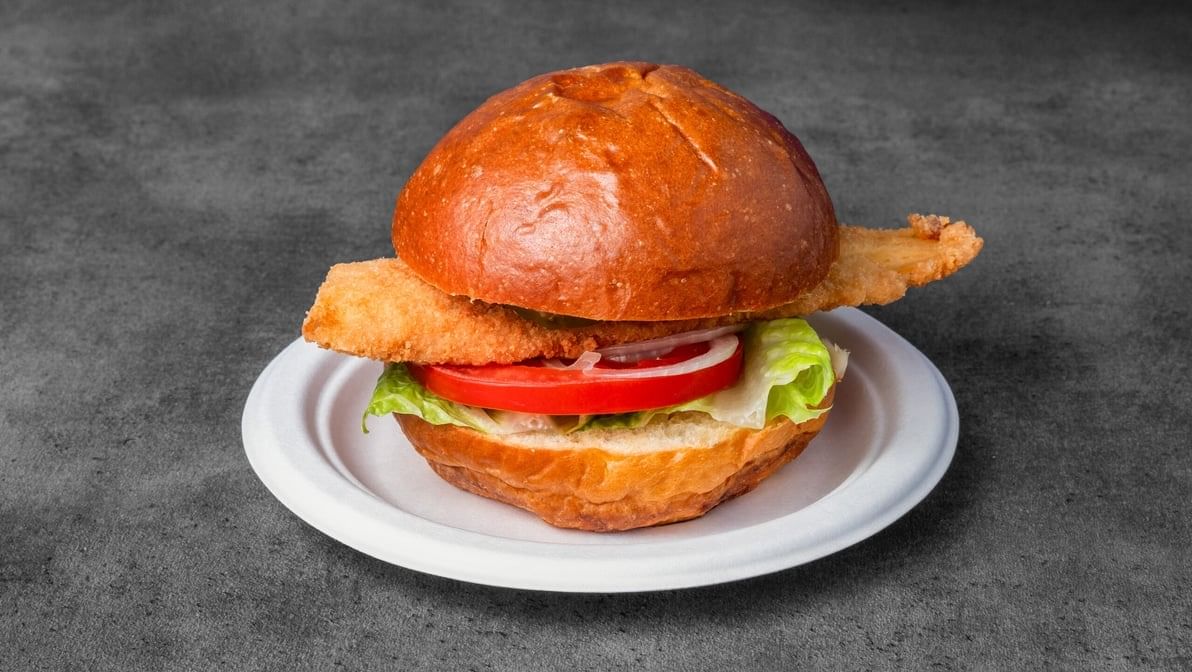 Crispy fried fish fillet with lettuce, tomato, and onion on a soft bun.