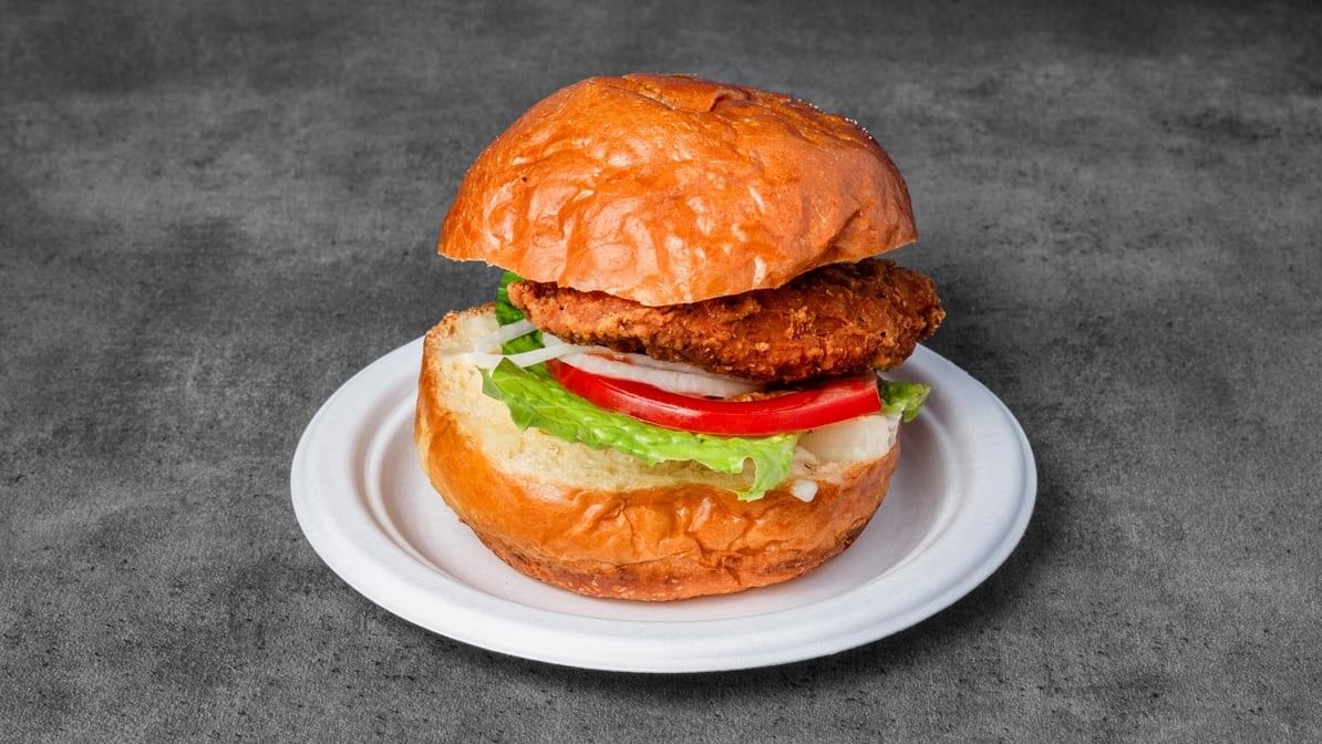 Freshly cut steroid free antibiotic free chicken breast hand breaded and battered served on a brioche bun with fresh salad lettuce tomato onions