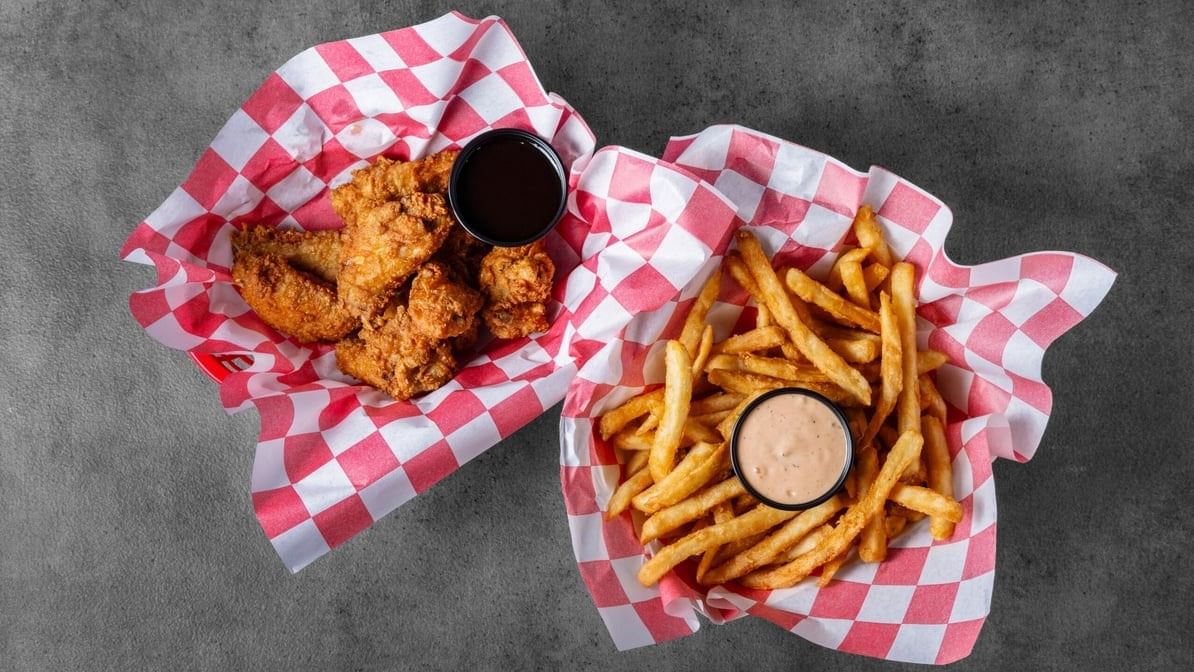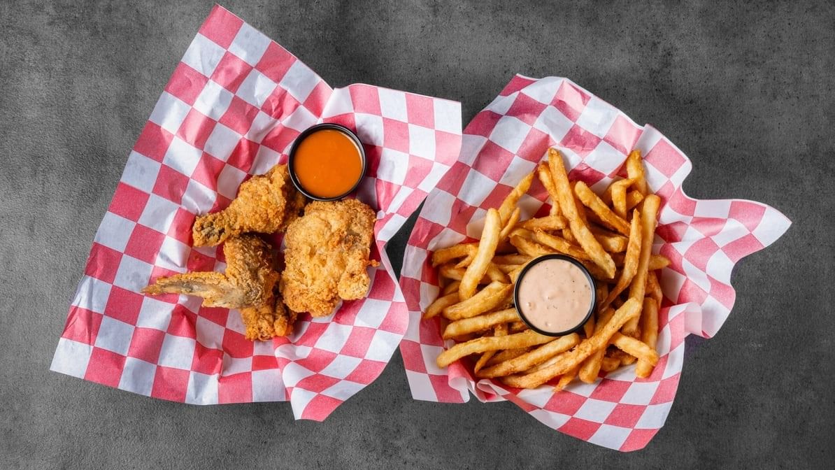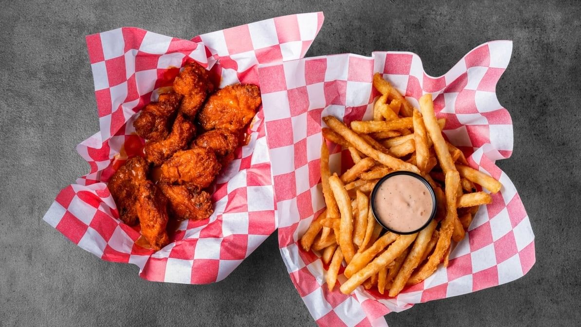 Served with soda and a variety of sauces. Options include multiple wing quantities, soda flavors, and five different sauces. Served with French fries.