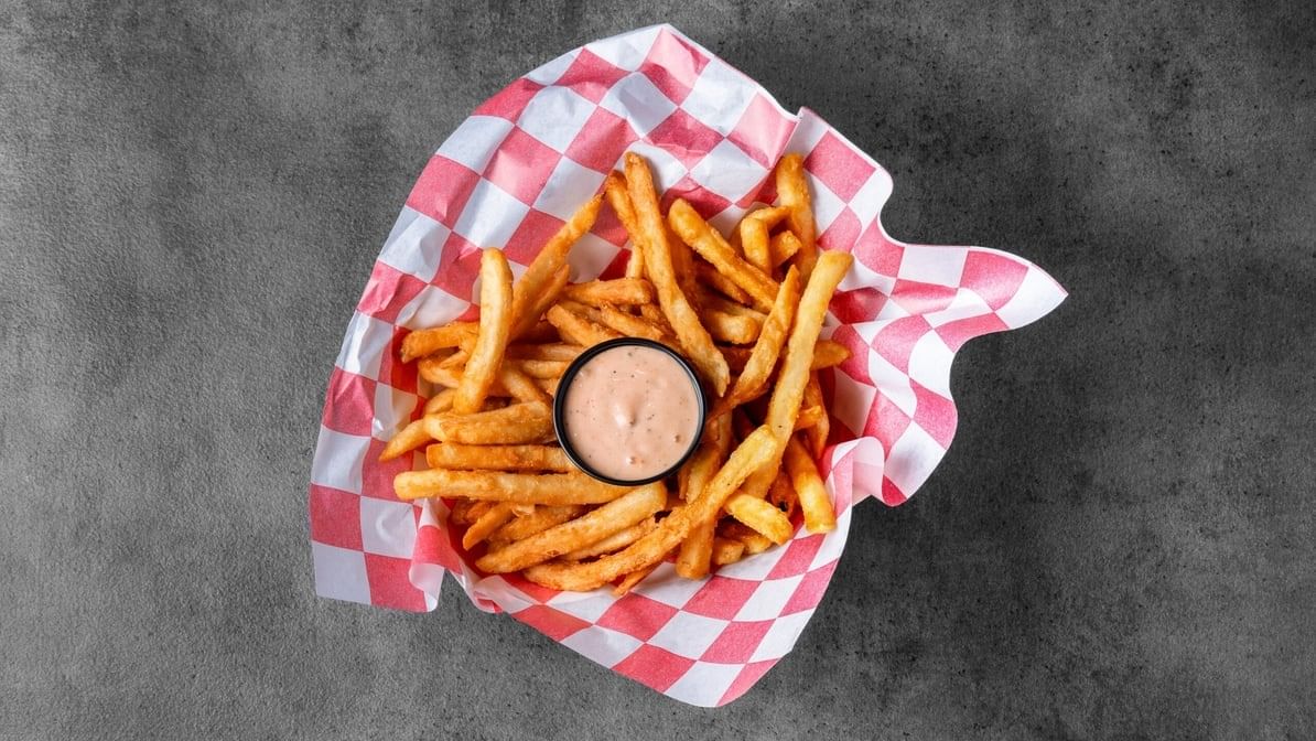 White, hot, BBQ, green, house. Drink: Cola, Diet Cola, Lemon-Lime. Served with French fries.
